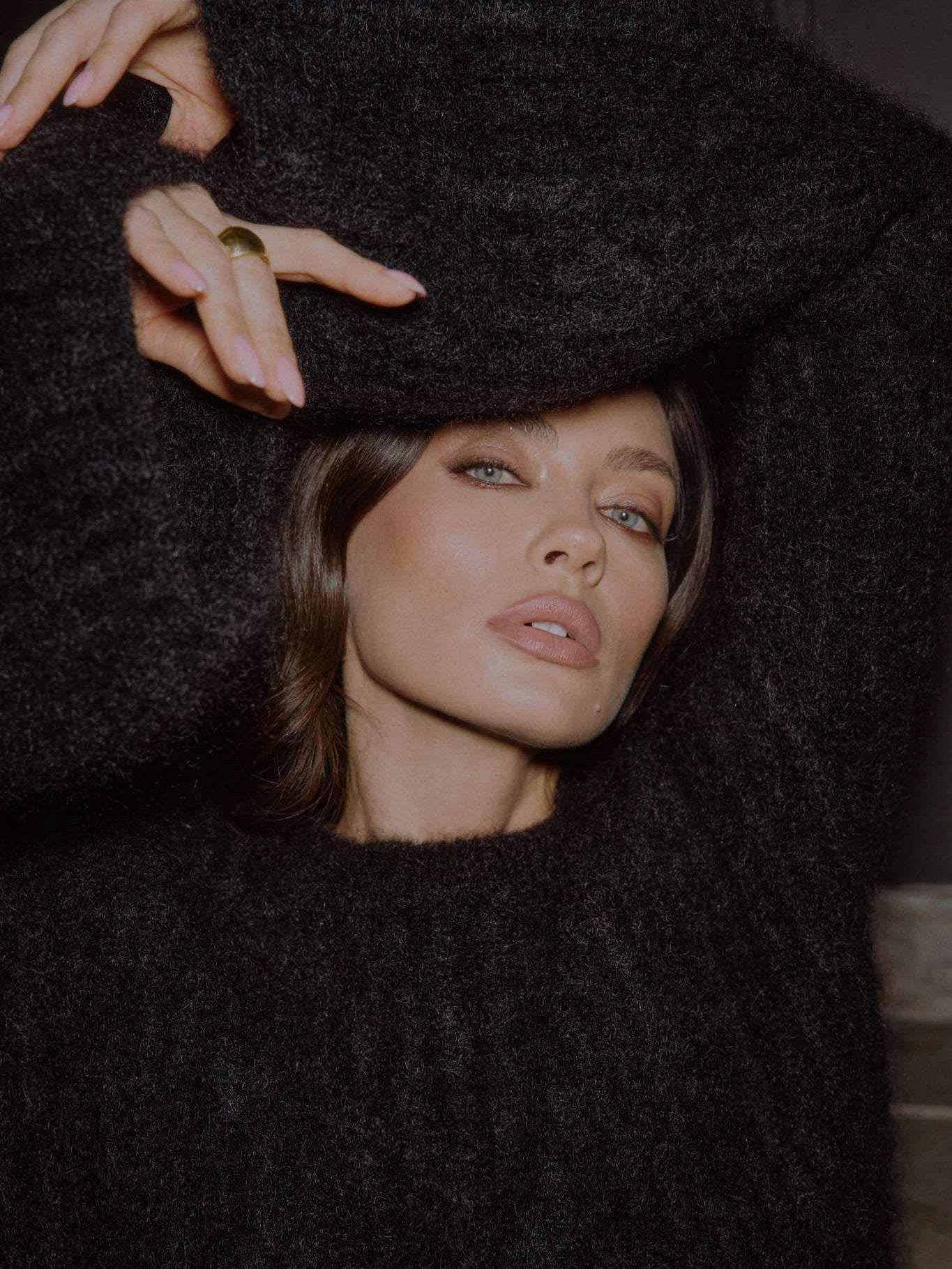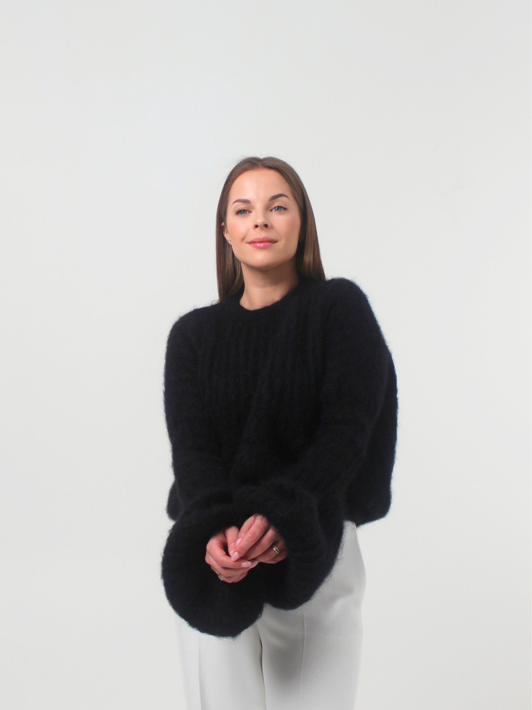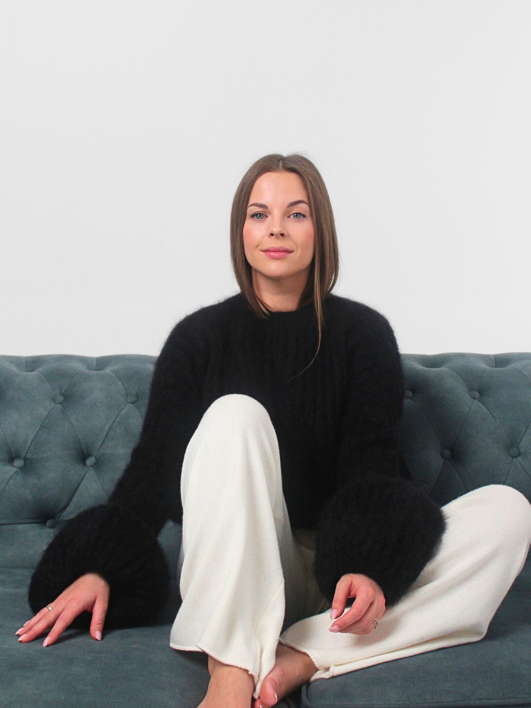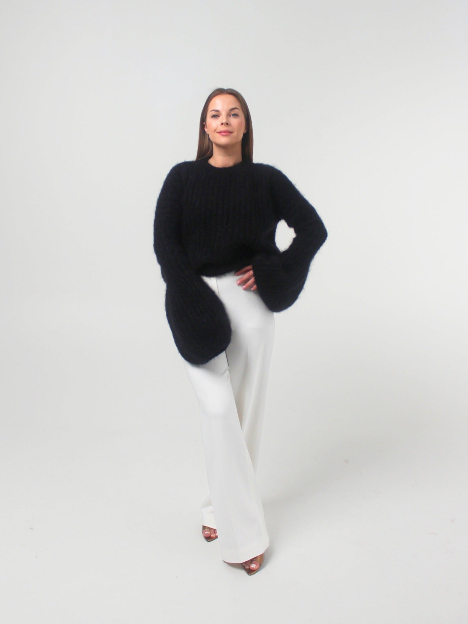 Modelis, kuris suteikia žavesio bei elegancijos kiekvienam drabužių deriniui. Trumpo ir laisvo kirpimo, platėjančiomis rankovėmis. Ieškančioms originalumo ir subtilumo savo spintoje, bei mėgstančioms individualų skonį ir stilių. Megztinis pagamintas iš prabangių, itin subtilių ir malonių liesti, superkid moheros siūlų.
