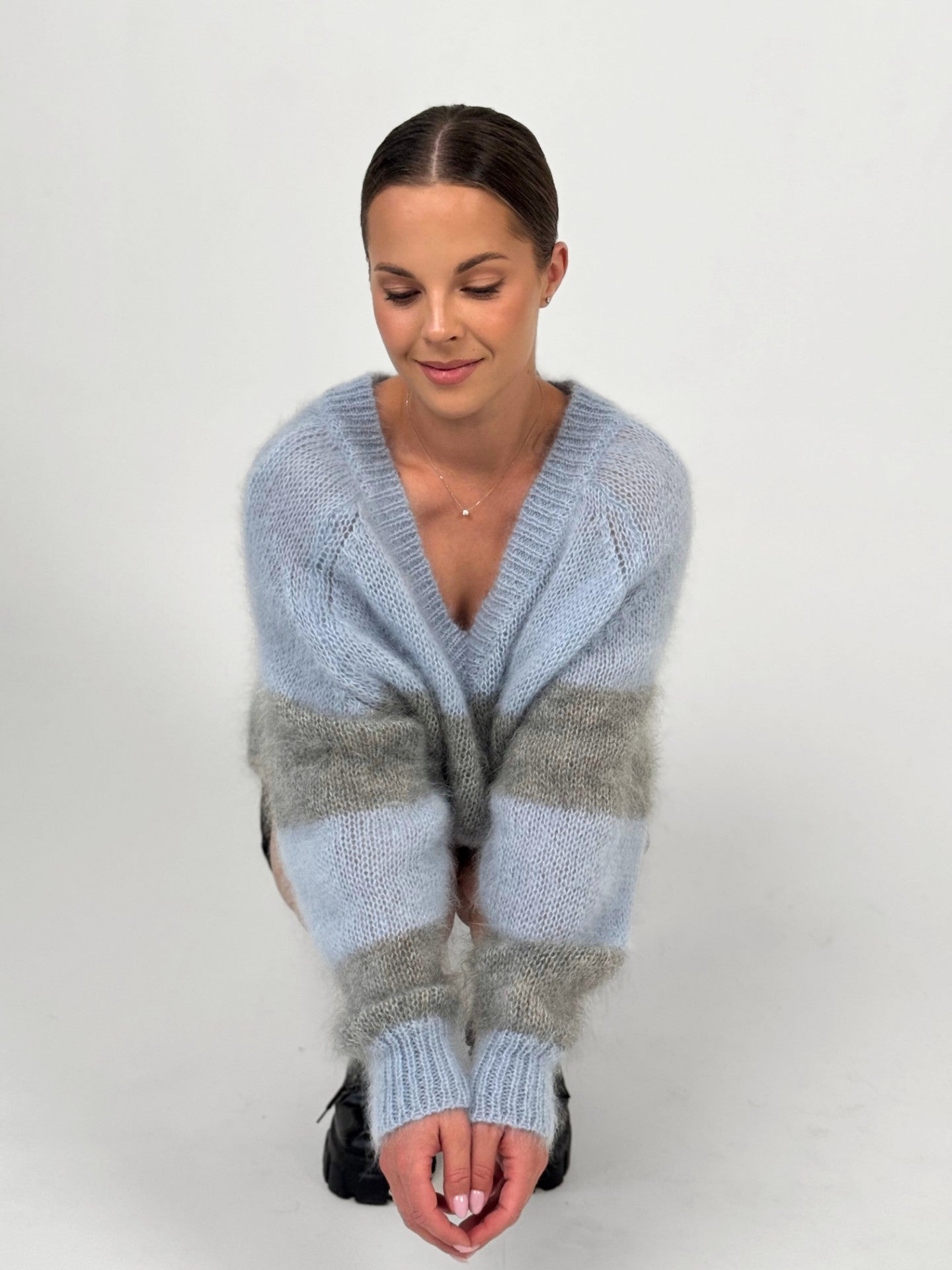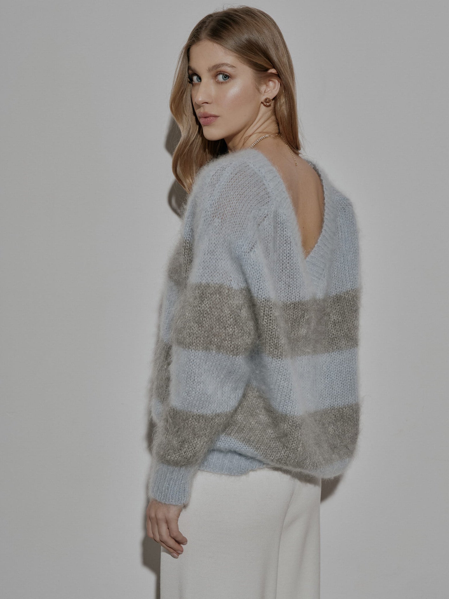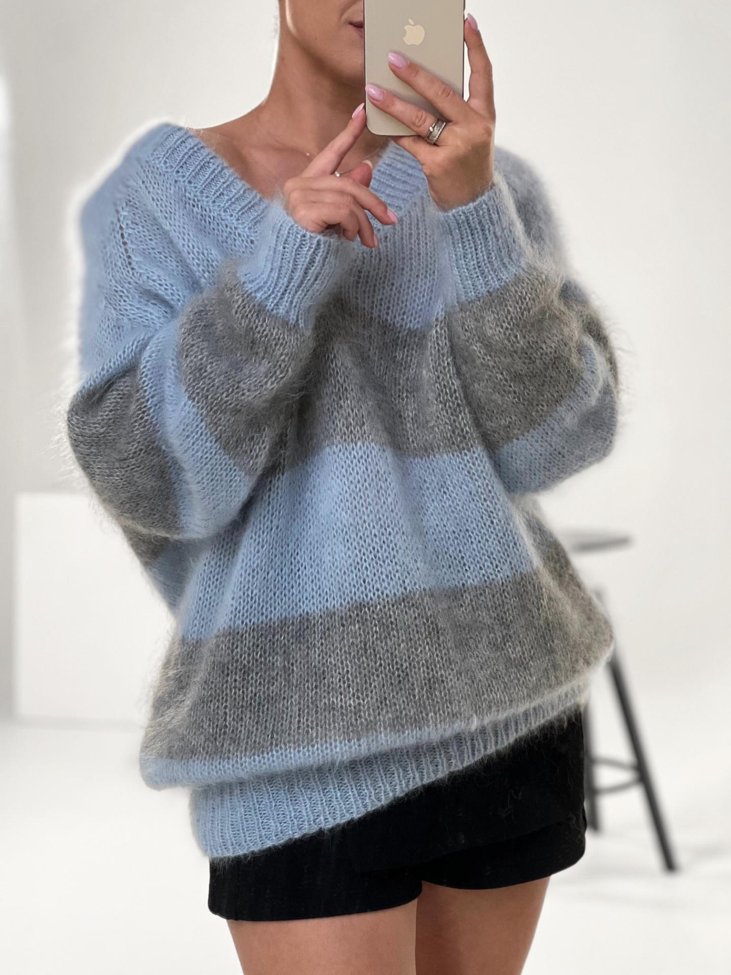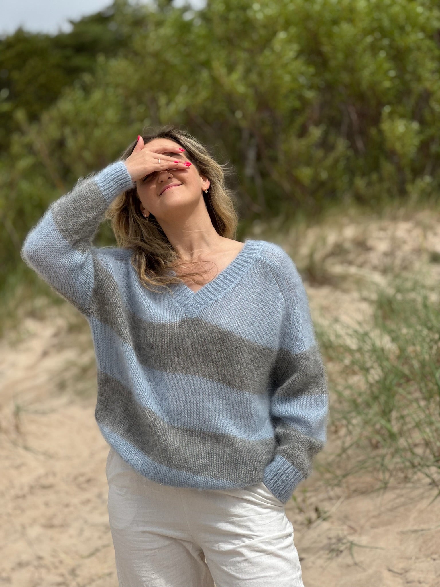 Tai JULIETE megztinio žaismingoji versija. Žaismingų ir subtilių spalvų kombinacijos bei purumas ir minkštumas užtikrina maksimalų jaukumo, išskirtinumo ir komforto pojūtį. Megztinio laisvas kirpimas bei ilgis sukuria laisvumo pojūtį. V iškirptė priekyje ir nugaroje bei ilgos, laisvos rankovės sukuria unikalų siluetą. Visi šio modelio megztiniai išsiskiria plačiomis, spalvotomis, horizontaliomis juostomis.