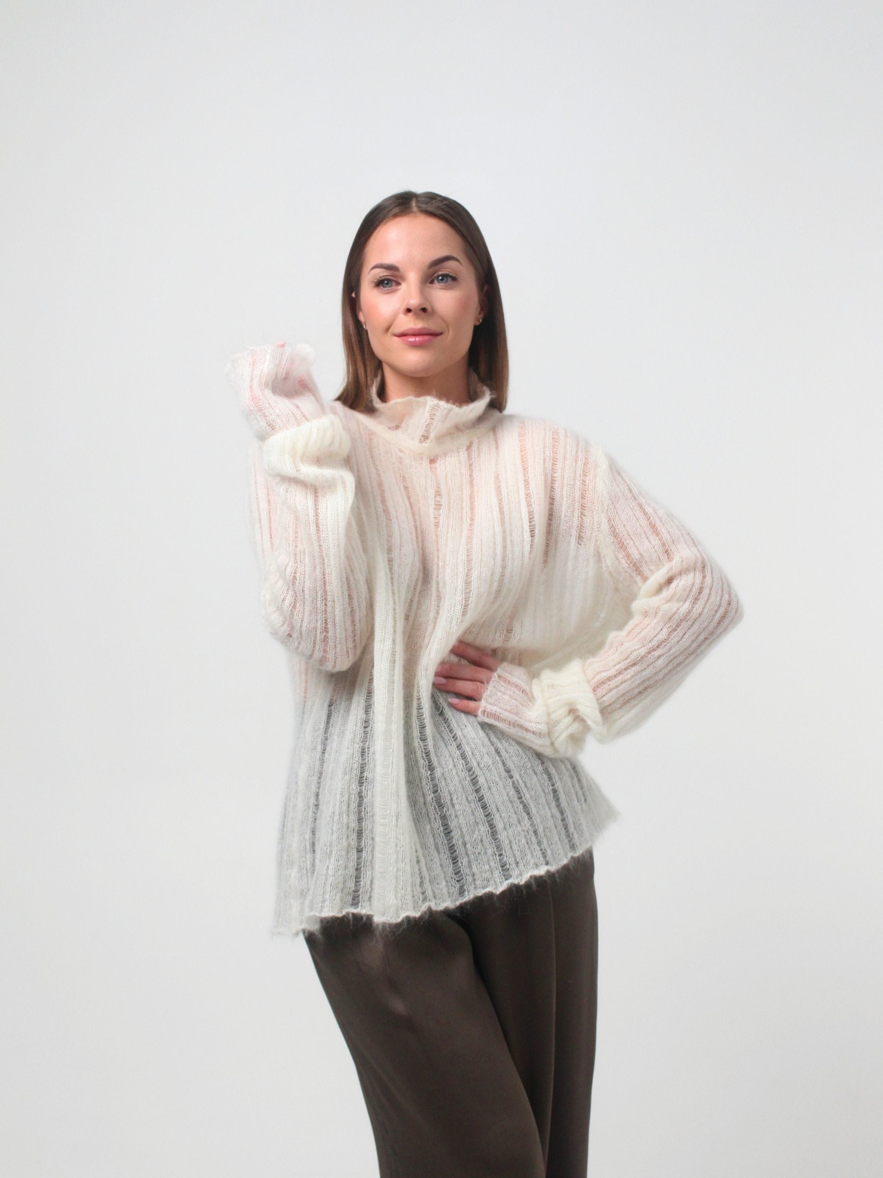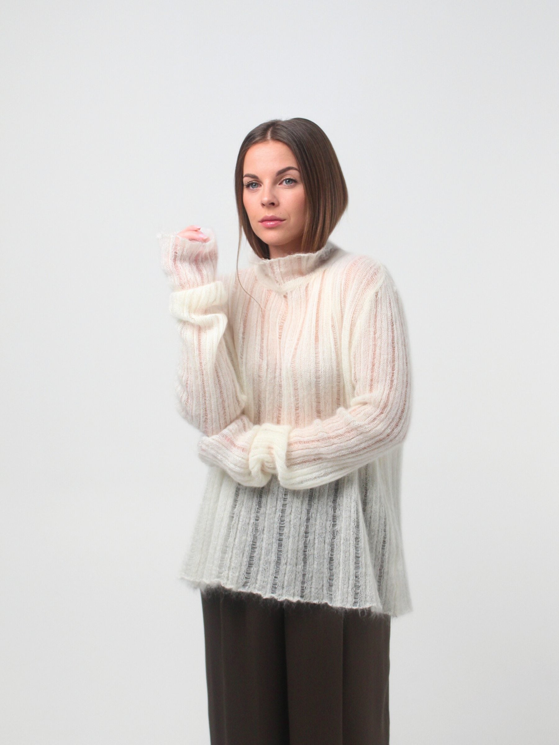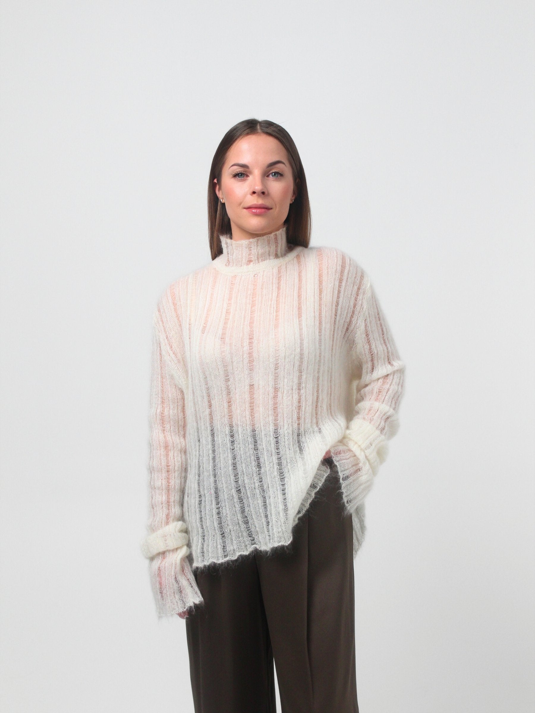 Megztinis, kuriame harmoningai susipina prabanga ir madingas, laikui nepavaldus dizainas. Modelis išsiskiria prailgintomis rankovėmis ir subtiliu kiauraraščio mezgimu. Paaukštinta apykaklė suteikia papildomo komforto ir išskirtinumo, o laisvas kirpimas ne tik leidžia laisvai judėti, bet ir suteikia galimybę šį megztinį derinti įvairiais būdais. Pagamintas iš prabangių superkid moheros verpalų ir ypatingai plonos vilnos, kuri užtikrina komfortą ir kokybę.