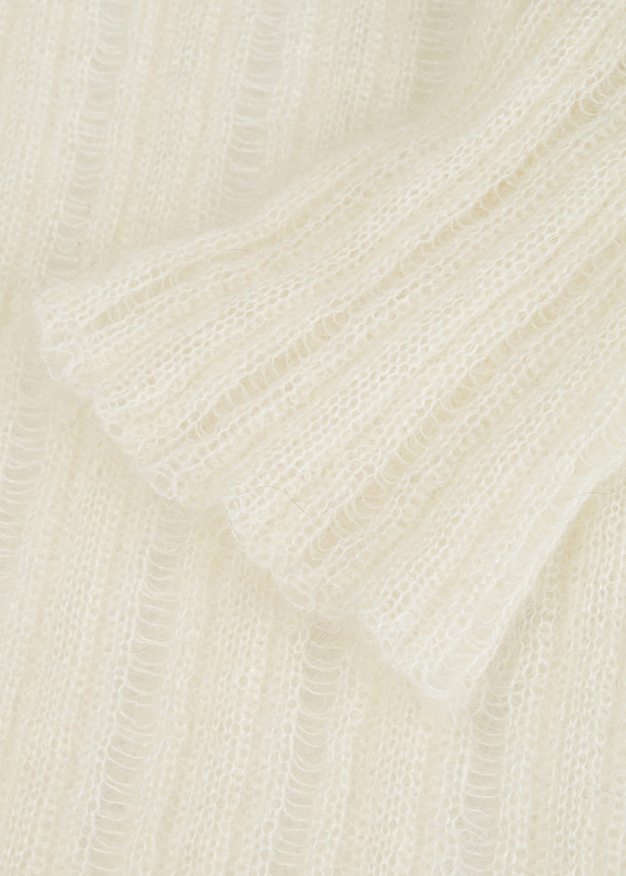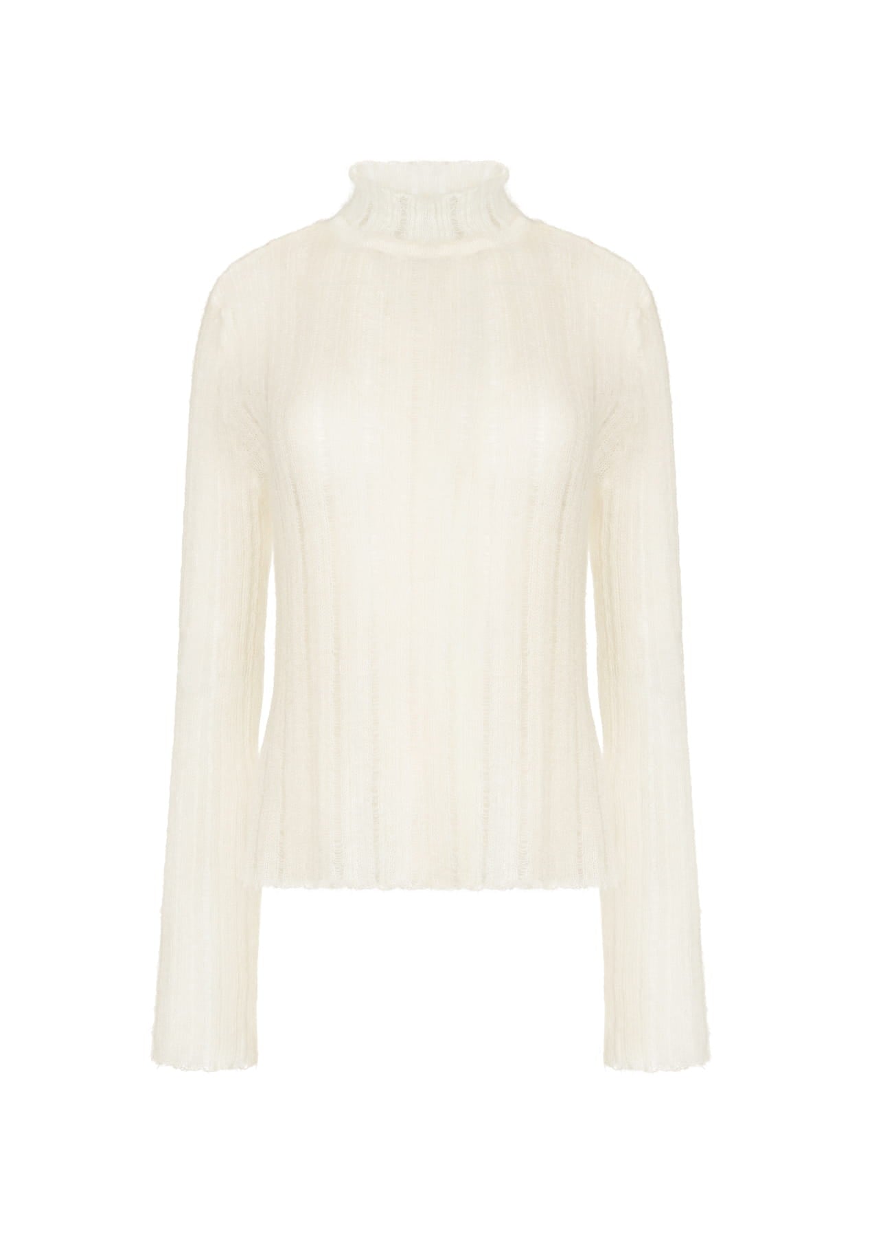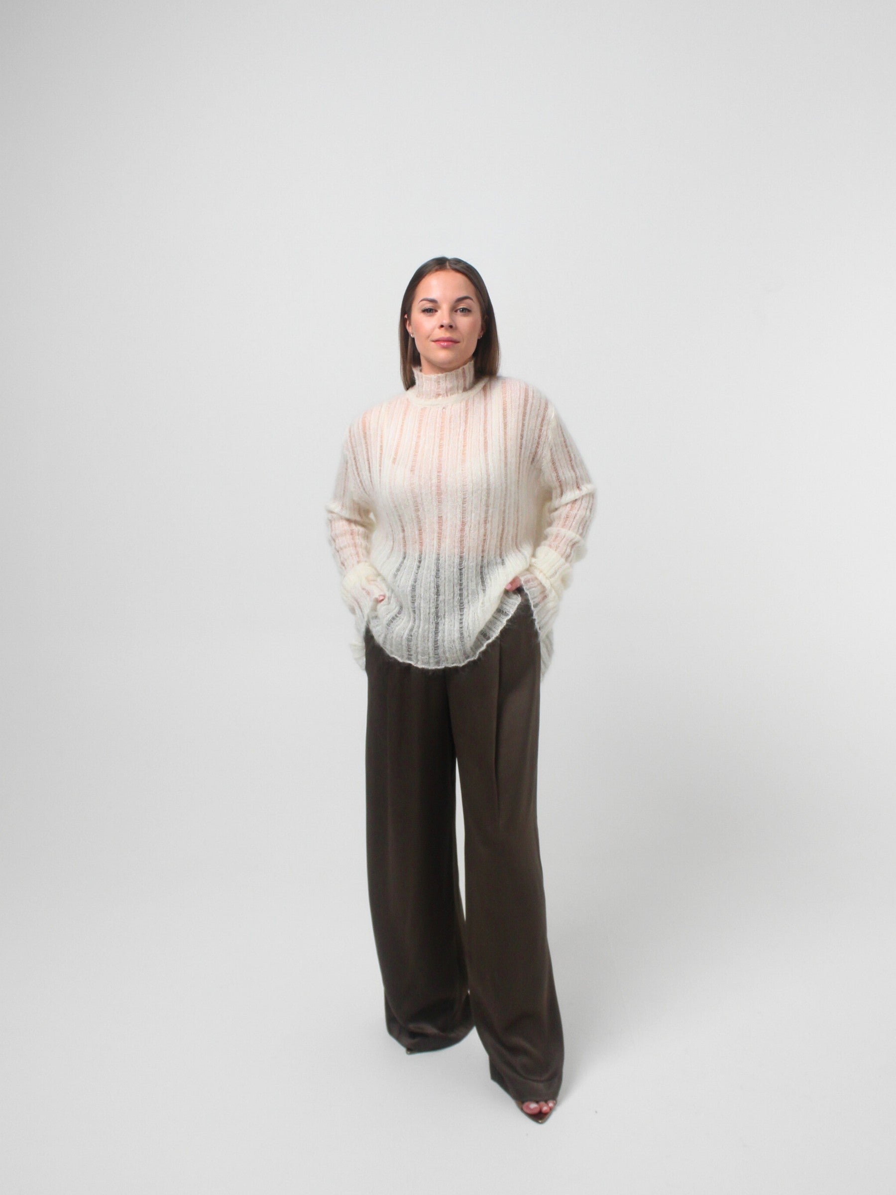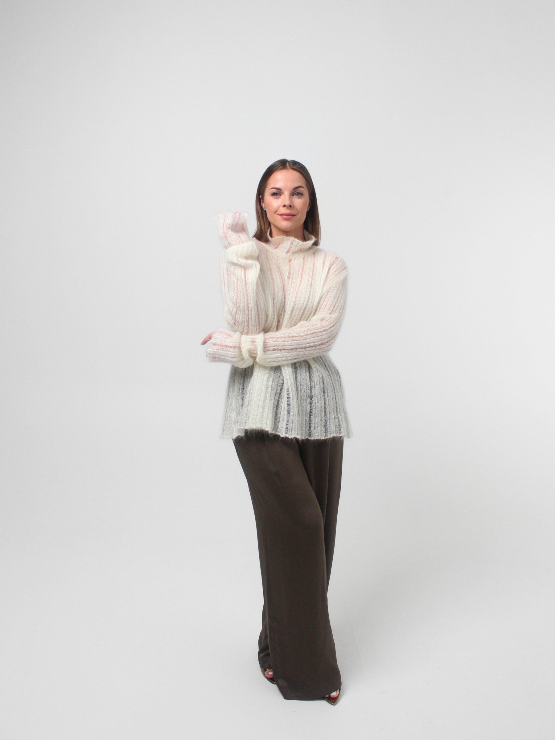 Megztinis, kuriame harmoningai susipina prabanga ir madingas, laikui nepavaldus dizainas. Modelis išsiskiria prailgintomis rankovėmis ir subtiliu kiauraraščio mezgimu. Paaukštinta apykaklė suteikia papildomo komforto ir išskirtinumo, o laisvas kirpimas ne tik leidžia laisvai judėti, bet ir suteikia galimybę šį megztinį derinti įvairiais būdais. Pagamintas iš prabangių superkid moheros verpalų ir ypatingai plonos vilnos, kuri užtikrina komfortą ir kokybę.